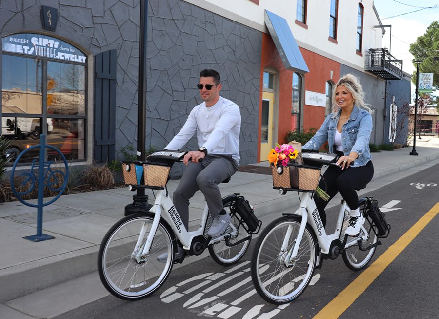 Rachel and Ryan Thomas, owners of Rare Air Trampoline Park, take a break from business to relax on a ride around downtown Redding on a pair of Bike Share pedal assisted bikes. Photo by Nyla Schmidt