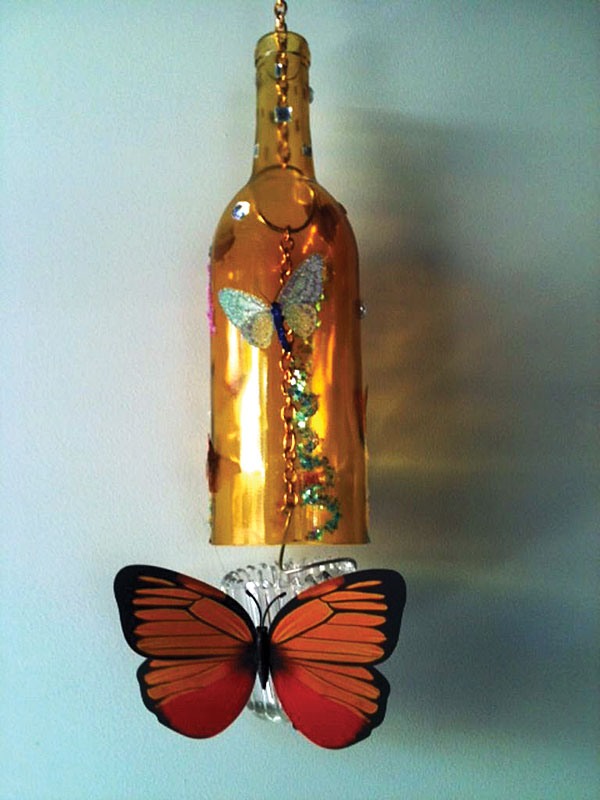 As her hobby and skill evolved, Baker kept trying new things. Her website, http://www.bottleartwindchimes.com, showcases everything from the original candleholders to hurricane lamps to wind chimes, all made from upcycled wine bottles. She also makes wind chimes out of small vintage bottles. Some of the bottles she paints; some she turns into drinking glasses.