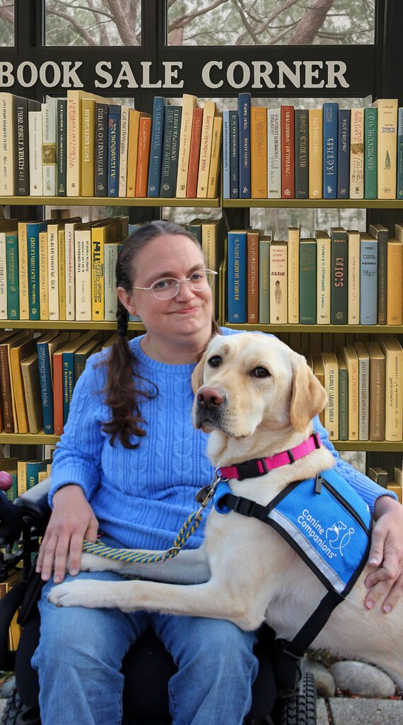 Bethany has an AA in Early Childhood Education from College of the Siskiyous, which she says she “uses every single day in my work” and is assisted by Gemma, her beautiful, loving guide dog. Gemma can pick up items Bethany drops, help her take off her coat and open doors for her. (The library doors have ropes on them for Gemma to use to pull open the doors and Gemma can also press the automatic door panels to allow Bethany to easily enter and exit buildings.)